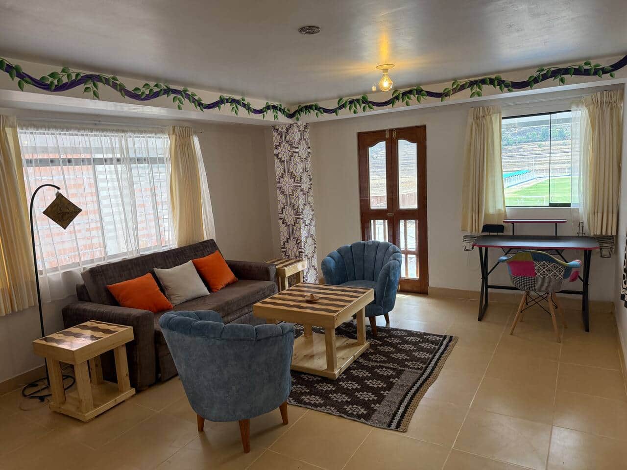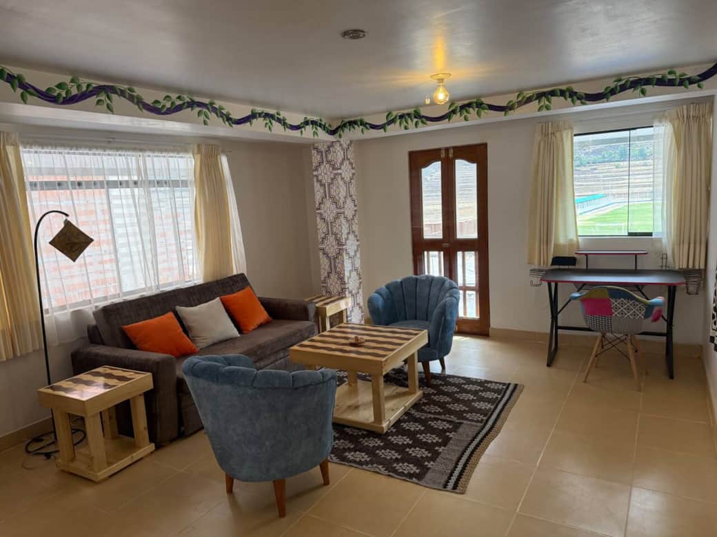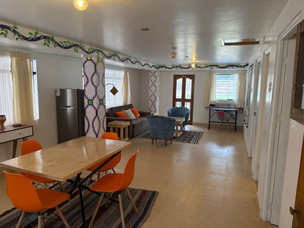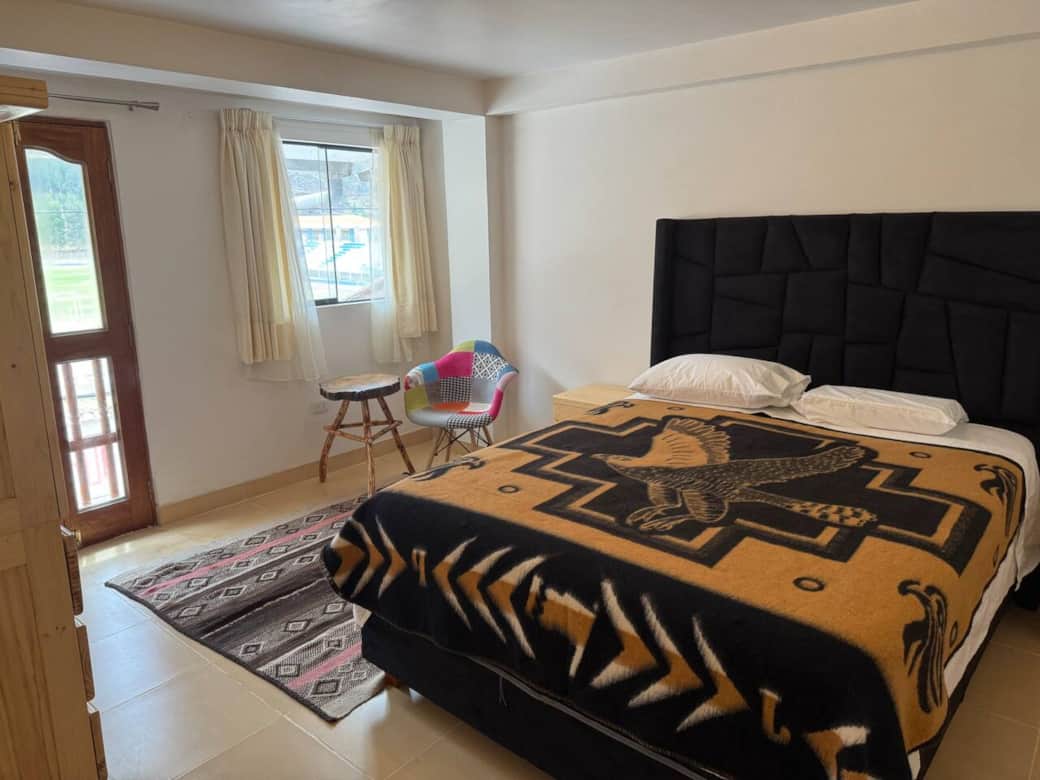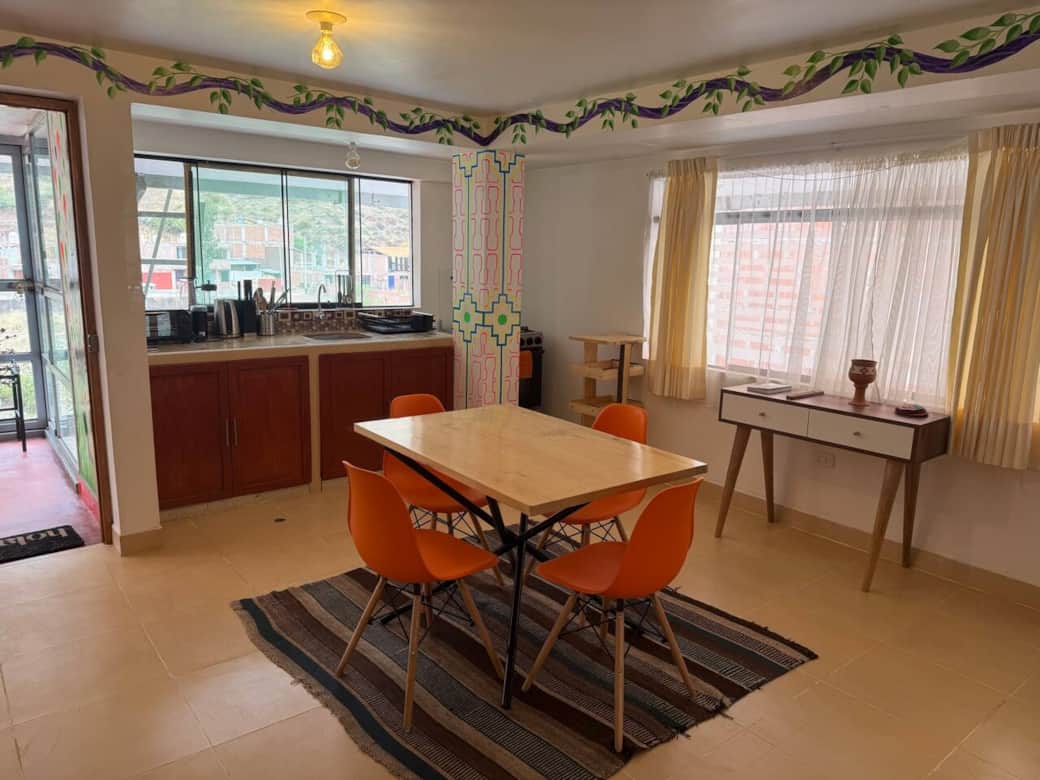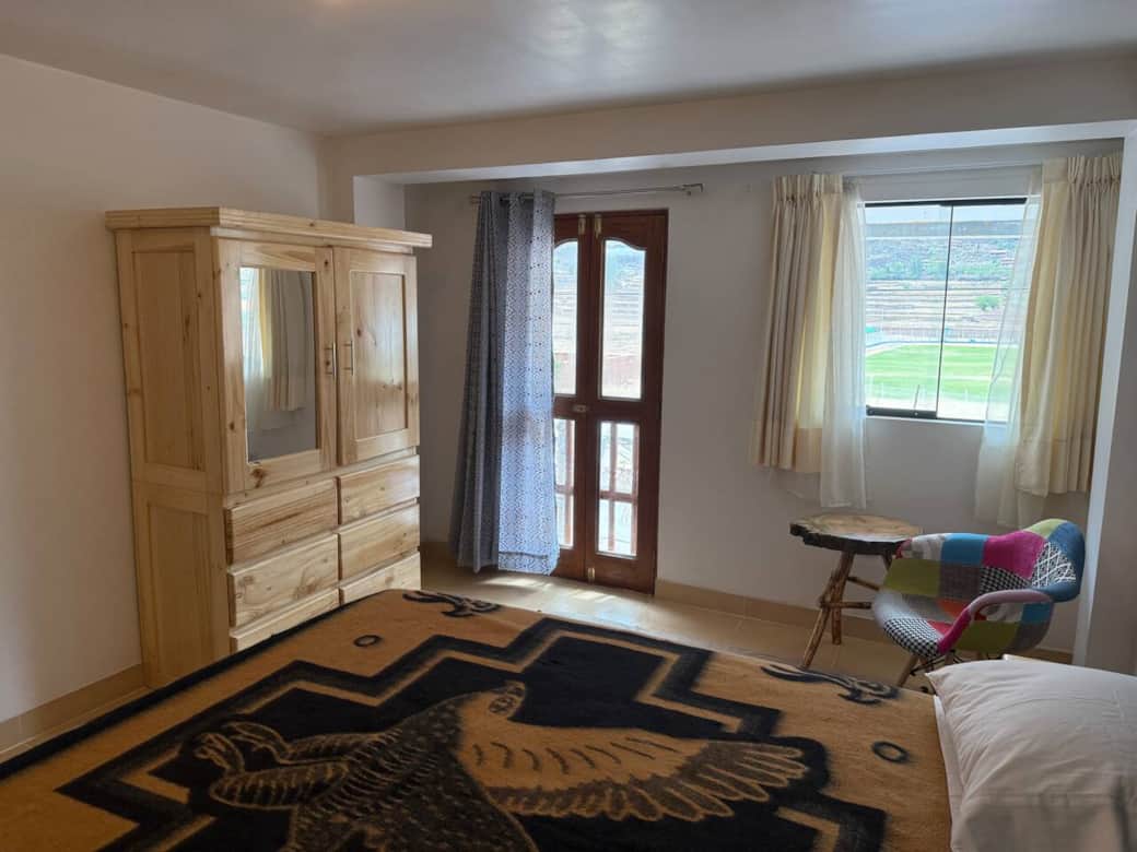 Spacious, thoughtfully decorated, third floor unit with stunning mountain and river views. Incredible original murals and artwork inside and outside by renowned Shipibo artists provide energetic and spiritual activations. Riverfront property; 7 minute-walk from downtown Pisac. Comfortable living room with office and dining areas. Beds have pillowtop mattresses, memory foam and microfiber pillows, and alpaca blankets. Complete kitchen. Enclosed common area patio with kitchen and bathroom.